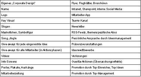 - Konkrete Anregungen für Maßnahmen und Medien zur Promotion finden Sie im Abschnitt 2.4.2 in den „Perspektiven des Ideenmanagements“ und in den Abschnitten 4.2.1 bis 4.2.6 in der „Toolbox Ideenmanagement“. Weitere Praxisbeispiele finden Sie in den Blogbeiträgen „Inspiration und Anreize für Einreicher – eine Ideensammlung für nicht-monetäre Incentives“, „Kampagnen, Wettbewerbe und andere Sonderaktionen – Praxisbeispiele“, „Erfolgsfaktor 4/9 – Commitment: Promotion“, „Erfolgsfaktor 8/9 – Ressourcen: Sichtbarkeit und Marketing“, „Jubiläen und Feiern als Anlässe für Marketingmaßnahmen“ und „Markenidentität des Ideenmanagements“.