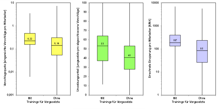 - Von den Unternehmen, die „Trainings für Vorgesetzte“ durchführen, haben 71% eine Vorschlagsquote oberhalb des Medianwerts von 0,16 VV/MA.