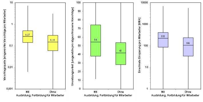 Beispiel 1 „Qualifizierung“: Im Blogbeitrag „Mehr, besser, lohnender: Wie Sie das Olympische Motto auf Ideen ummünzen“ ging es u.a. um „Trainings für Vorgesetzte“ und „systematische Ausbildung, Fortbildung für Mitarbeiter“, die im ergänzenden Benchmarking des „Kennzahlenvergleichs Ideenmanagement 2023“ als Ansatzpunkte zur Erhöhung der Einsparung und/oder der Vorschlagsqualität abgefragt worden waren. Der Unterschied zwischen der Gruppe „mit solchen Maßnahmen“ und der Gruppe „ohne solche Maßnahmen“ war dort in Nebeneinanderstellungen von Boxplotdiagrammen für die Vorschlagsquote, den Umsetzungsanteil und die Einsparungsquote veranschaulicht worden, die hier nochmal in den Abbildungen 2 und 3 gezeigt sind.