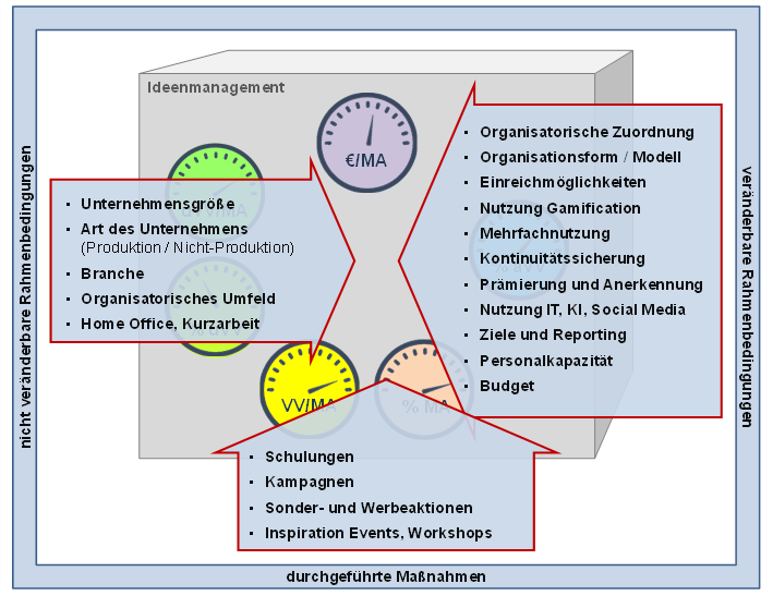 Abb. 4: Ideenmanagement als „Black Box“ mit „Messgeräten“ für die Beteiligungsquote [% MA], die Vorschlagsquote [VV/MA], den Umsetzungsanteil [% uVV], die Umsetzungsquote [uVV/MA], die Einsparungsquote [€/MA] und den Abarbeitungsanteil [% aVV] – eingebettet in ein Umfeld aus Rahmenbedingungen und Maßnahmen